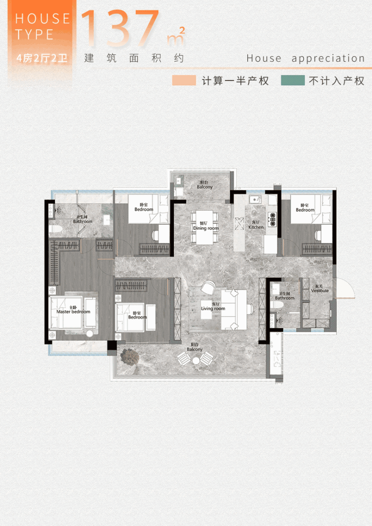 在户型设计上,越秀·万博城|和臻二期产品堪称“空间魔术”的代表,其最大亮点在于将建筑使用率推高至120%。这一数据的实现,主要得益于对飘窗、阳台等赠送面积的极致优化,将这些原本半赠送或全赠送的空间转化为可实际使用的室内面积。以即将推出的建面约105平方米四房两厅两卫户型为例,其餐厅宽度升级至约4.3米,客厅开间最大可扩展至约6.1米,使得整个餐客厅区域的实际使用面积超过30平方米,这一尺度通常只出现在市面上150平方米以上的大户型中。该户型采用LDKB(客餐厨阳台)一体化设计,四开间朝南,主卧配备270°全景飘窗,不仅采光面极大,更提供了可观的CBD墅景。另一款建面约128平方米的户型则将改善属性发挥到极致,实现了南北对流,南向面宽长达约15.65米,这一数据甚至可与顶级豪宅侨鑫汇悦台约236平方米的大平层相媲美。其约8.65米的IMAX阔景阳台,无遮挡地面向低密墅景,主卧更配备了步入式衣帽间和独立卫浴。所有户型均强调“全屋空间均好性”,即不仅仅是客厅宽敞,每一个卧室都拥有充盈的尺度和良好的景观面。这种设计逻辑,本质上是将有限的建筑面积通过结构优化,转化为更高的居住舒适度,满足了多孩家庭或三代同堂家庭对于功能分区与空间尺度的双重需求。