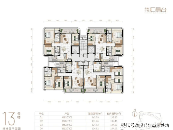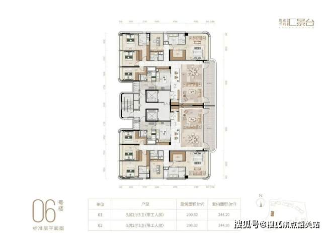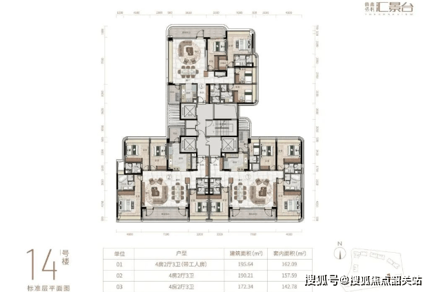 汇景台提供多种户型选择,涵盖123-352㎡的三至五房,户型实用率高达约82-84%。其中,部分典型户型包括:
