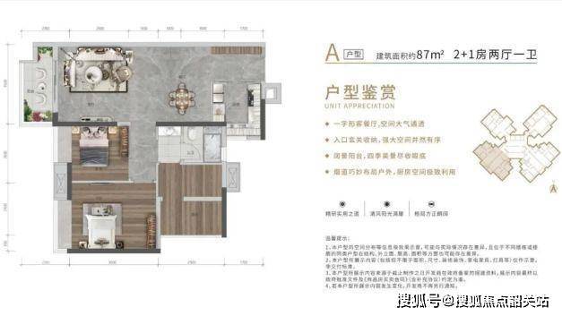 A 户型 - 约 87 平方米、2 + 1 房两厅一卫