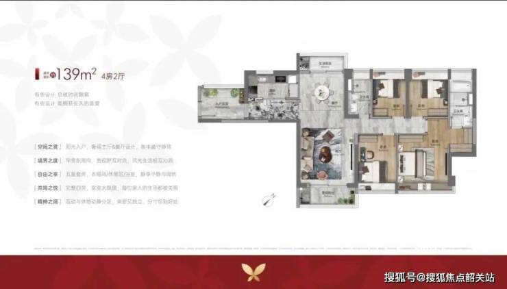 139㎡四房两厅两卫:LDK一体化设计,四开间朝南,巨幕宽景阳台,提升生活品质。