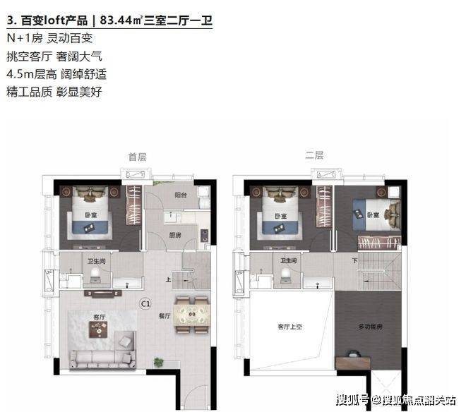 户型设计亮点多多,空间利用灵活。约 25 - 92㎡轻奢平层公寓,像 44㎡一室一厅一卫户型,入户玄关私享生活,全明设计舒适奢阔;59㎡一室二厅一卫户型,卧连阳台盛景入室。约 45 - 95㎡百变 LOFT 产品,如 83.44㎡三室二厅一卫户型,4.5m 层高,挑空客厅奢阔大气,N + 1 房灵动百变。每个户型都充分考虑居住和使用需求,空间布局合理,居住舒适度高,且宜商宜居,投资自住两相宜。