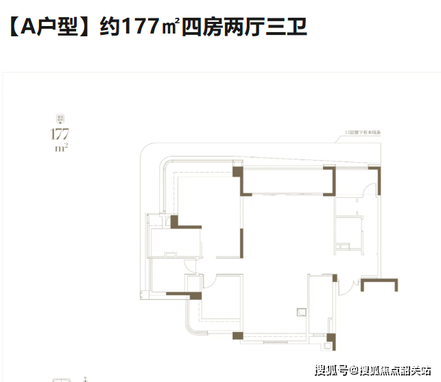 4. 建面约177㎡四房两厅三卫:客厅开间5.0米,主卧开间4.2米,次卧开间3.5米,阳台面积12.8㎡,公摊率20.5%,得房率79.5%,适合高端改善家庭,官方备案价8.3-8.5万/㎡,总价1469-1495万;