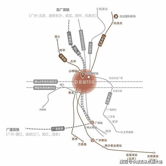 白云站作为亚洲规模领先的综合交通枢纽,在整体规划中承担着连接全国、通达世界的重要使命。其约263万㎡的体量形成强大交通引擎,集高铁、城轨、地铁等多重交通方式于一体,使城市能量在此汇聚辐射。项目距离白云站核心区直线可及,地铁多线交织覆盖,京广高铁、广湛高铁等线路通达南北,多条城轨与地铁构筑立体交通网络,形成真正意义上的“上盖枢纽生活圈”。便捷的交通体系让商务往来更高效,也让居住体验更具国际都会属性。