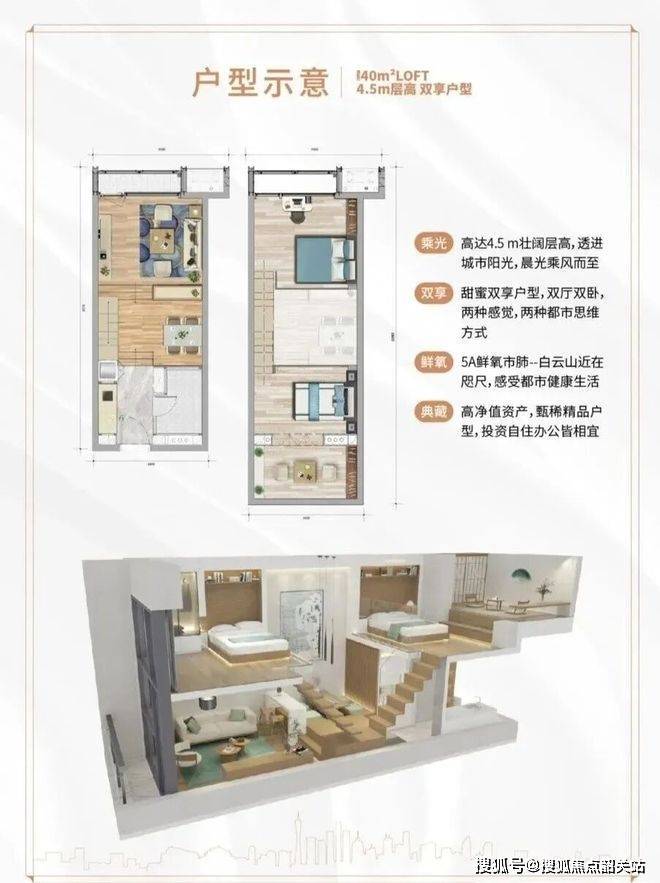 户型设计是这个项目的一大亮点。主推的31-57㎡区间,走的都是精致小户型路线,但因为是LOFT复式,实际使用空间被放大不少。层高有3.4米、3.6米和4.5米几种选择,其中4.5米挑高的那一档最吸睛,中空设计让空间感直接拉满。同样37㎡的面积,做成LOFT后,一层可以当客厅+开放式厨房,二层做卧室+衣帽间,甚至还能隔出独立书房或工作区。自住的话住着不憋屈,办公的话放两张桌子也游刃有余,投资出租的话因为户型小、总价低、好打理,也容易找到稳定客群。毛坯交付给了买家最大的自由度,想做日式极简、北欧风还是工业风,都能随心所欲改。