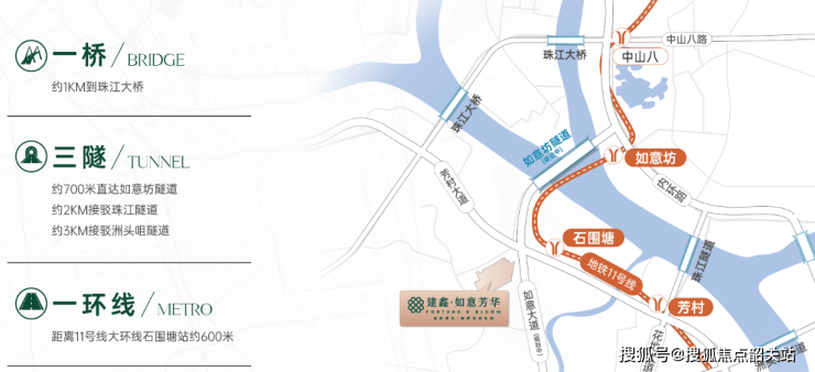 建鑫·如意芳华距离在建的地铁11号线石围塘站仅约600-800米,步行约8-15分钟即可到达。11号线作为广州首个大环线,途径多个中心区,换乘站多达14个,极大地提升了居民的出行便利性。此外,自驾方面,项目紧邻芳村大道,可通过洲头咀隧道、内环路等快速抵达天河、越秀等核心区域,未来如意坊二期高架道路建成后,出行将更加便捷。