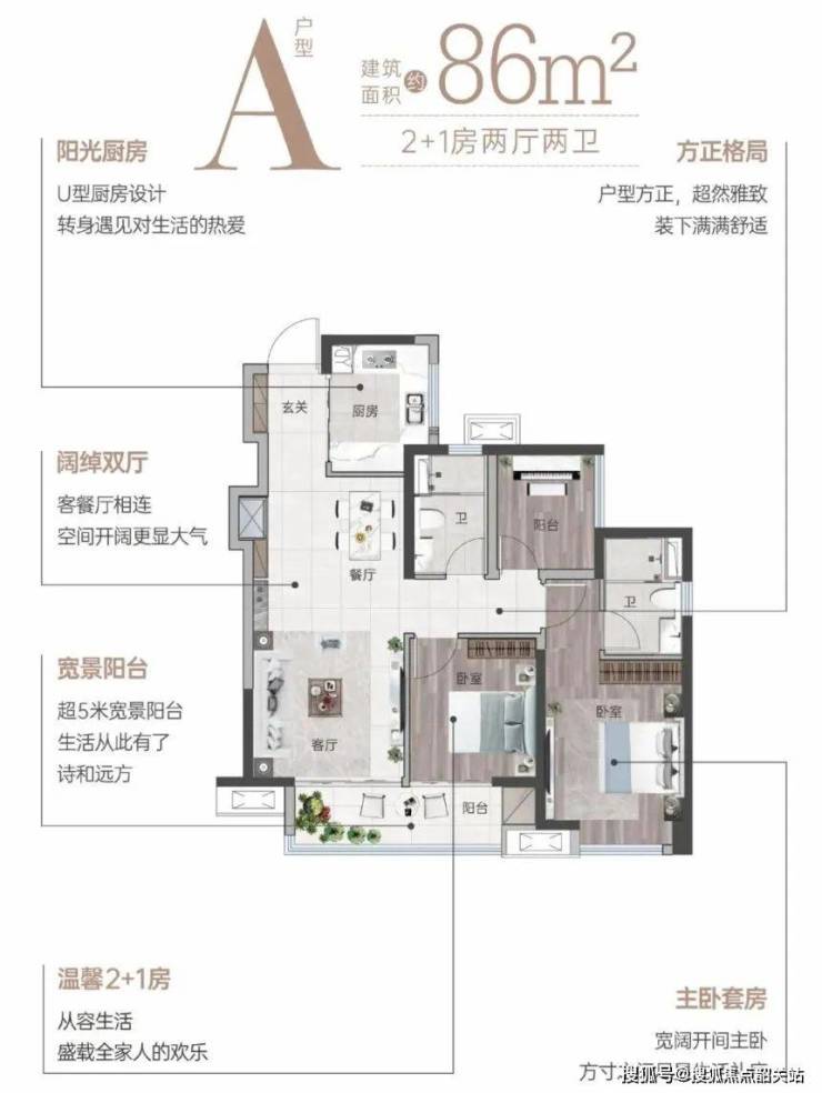 85㎡南向三房:拥有5米宽景阳台和主卧套间设计,总价190万起。