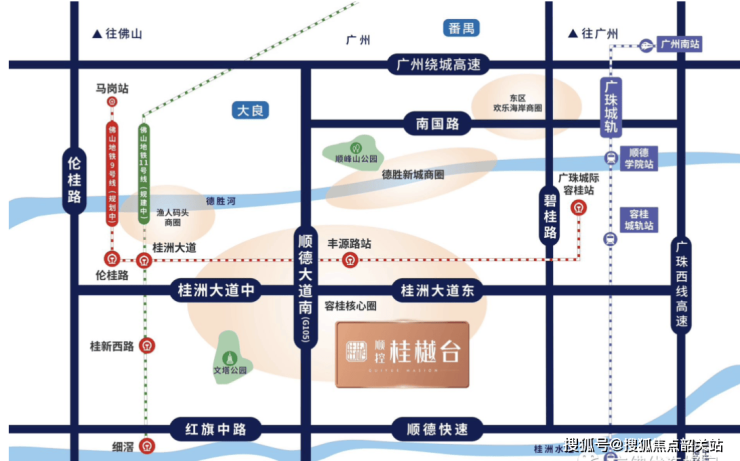 顺控桂樾台坐落于顺德容桂中心位置,拥有极佳的区位优势。容桂作为千亿产值强镇,城市化率已达七成,土地资源稀缺,项目占据容桂最后一块稀缺双公园地段,享受难得的自然环境和城市便利。交通方面,项目临近广珠城际容桂站,连接珠海中山广州等核心城市。同时依托广中江高速、广珠西线高速及佛山一环高速三条高速公路,形成多维立体交通网络。未来还将享受9号、11号和13号地铁线路覆盖,实现广佛同城自由切换。完善的交通体系保证了项目居民的出行高效便捷,极大提升生活品质。