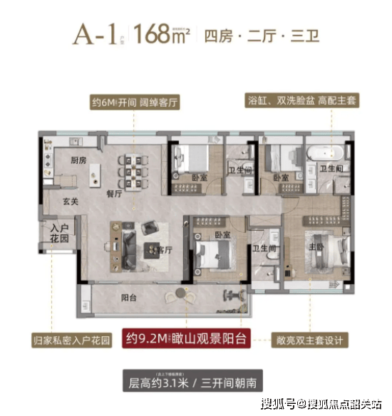 142平方米的阔绰四房则采用了两梯三户的设计,兼顾了居住效率与私密性。通透的格局搭配山景视野,使得日常居家十分惬意。这种设计不仅提升了居住的舒适度,还彰显了主人的身份与品味。而对于预算更为充裕的客户,168平方米的大平层则是终极之选。该项目采用两梯两户的配置,私密度拉满,超大观景阳台可直望梅花岭山景。精装交付搭载六大国际品牌系统,涵盖厨电、卫浴、智能安防等模块,细节处尽显实用与舒适。每一处设计都经过深思熟虑,旨在为业主打造极致的居住体验。