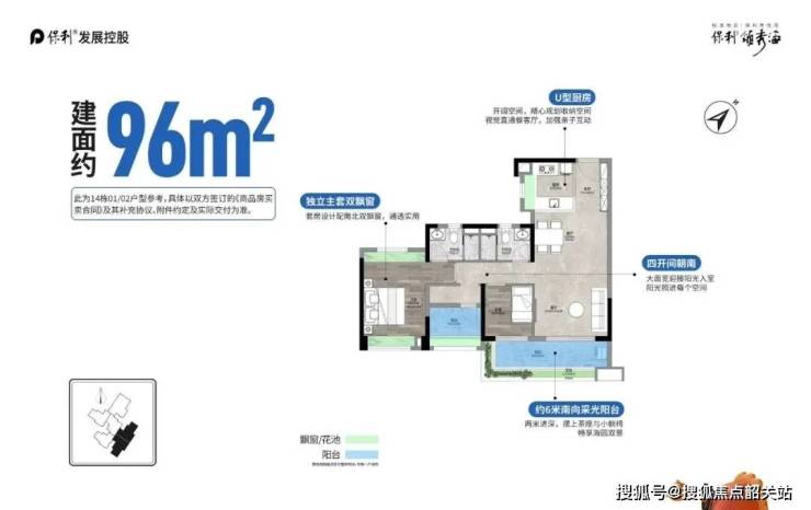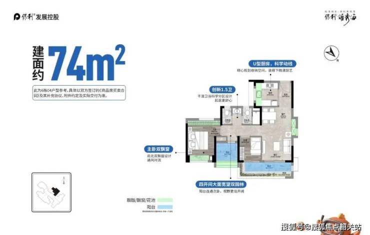 建面74平三房1.5卫,主卧双飘窗,南北对流,U型厨房,5.3米景观阳台
