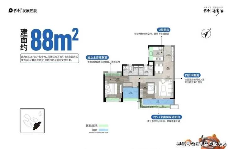 建面88平三房两卫,阳台连通次卧,5.7米南向景观阳台,东南向可看海