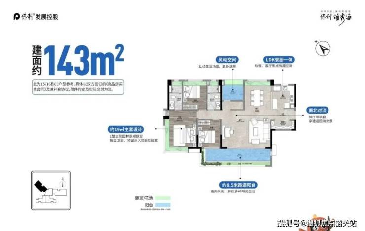 建面143平四房两卫,南北对流,约8.5米长阳台,西南西望园林,北向看海,主卧270度全景飘窗