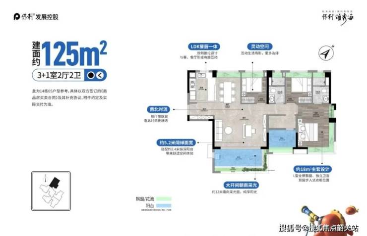 建面125平四房两卫,改善四房,18方豪华主套,L型全景飘窗,12米南向采光