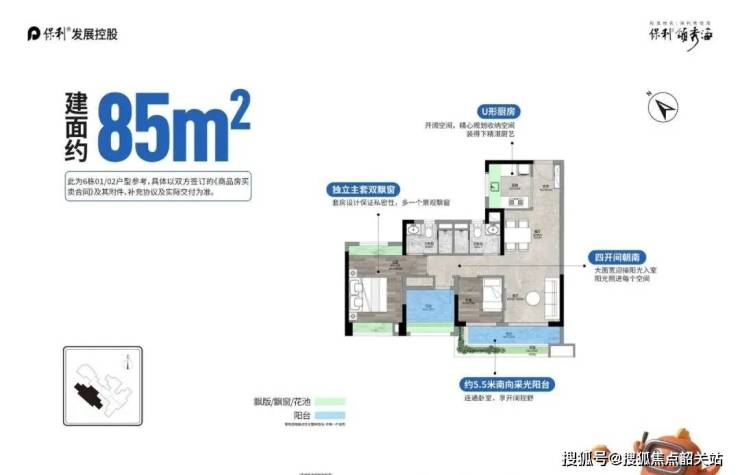 建面85平三房两卫,约5.5米景观阳台,西南西无遮挡,主套带双飘窗,四开间朝南