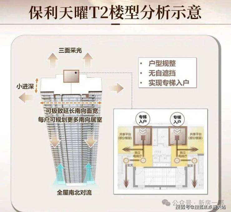 T2板式户型规整,通风强,互视少,可延伸南向大面宽,规划更多南向开间,实现专梯入户。