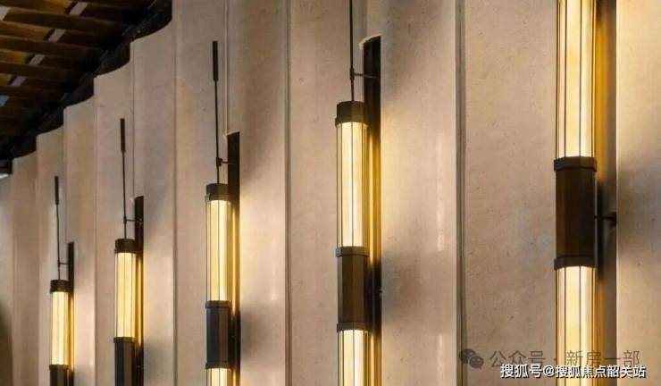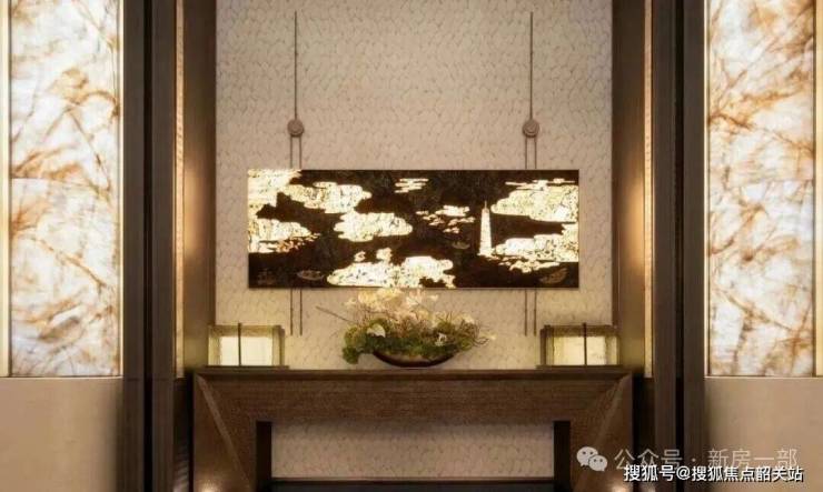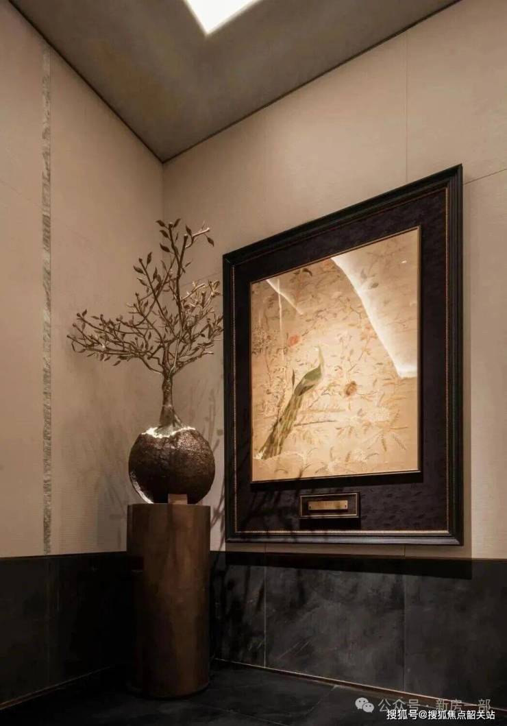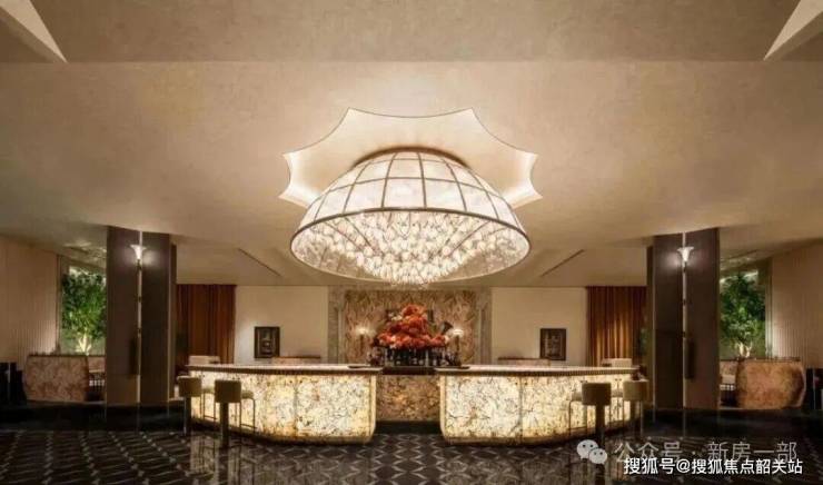 透过中空挂落,日光倾泻而入下方的“金石浮光”的艺术雕塑,阳光与金石肌理交织出细腻的纹理,低调奢华的氛围扑面而来。
