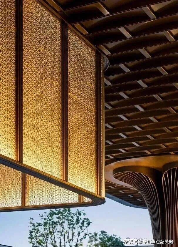 星曜会所的独特从外部空间便已彰显。中国建筑讲究导气,所以就有了“照壁”来阻挡气流,守卫家宅平安。天曜的照壁采用了一种特殊的工艺:电镀金鳞片。
