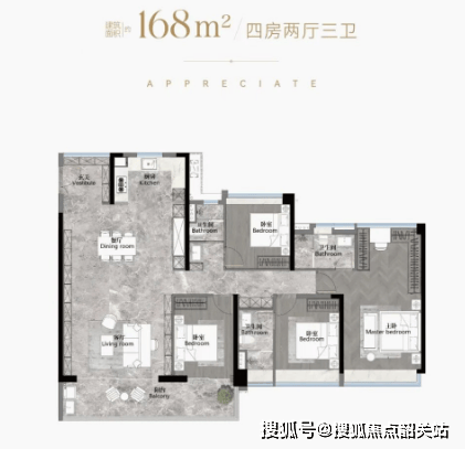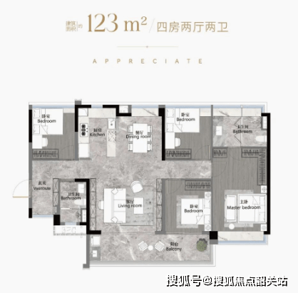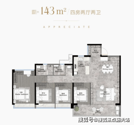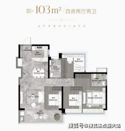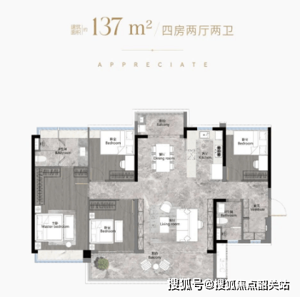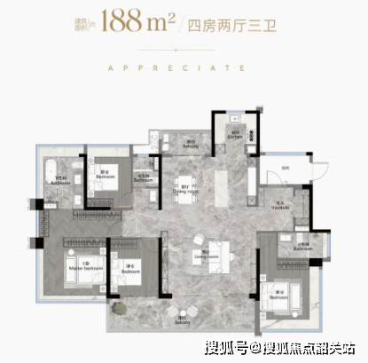 户型面积:从103平方米至186平方米的南向阔景四房