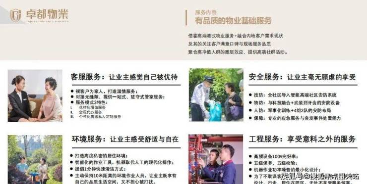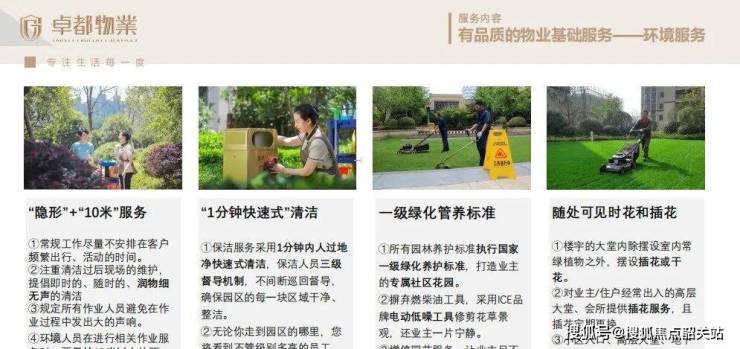景业名邦集团旗下卓都物业为广州市物业协会副会长单位,通过国际标准化组织(ISO)三标一体 认证,以“专注生活每一度”的服务理念,为客户提供高品质的生活服务,业务覆盖基础物业管理、社区运营等。
