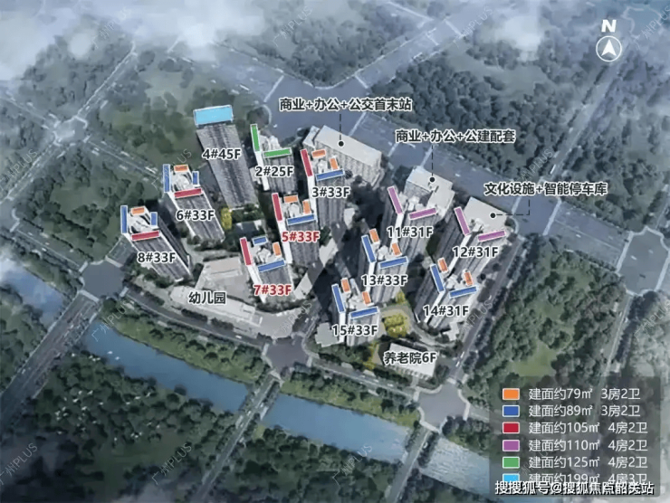 户型设计:项目采用现代建筑立面、人性化户型设计(得房率约82%)和智能化社区管理。以建面约105㎡三房两厅两卫为例,户型方正,南北通透,主卧套房设计,带独立卫浴和飘窗,居住舒适度极高。