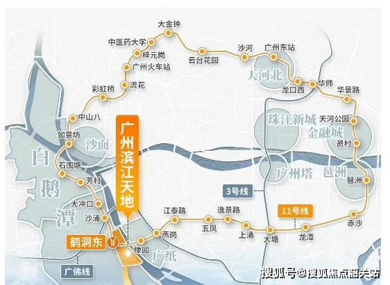 广州滨江天地拥有极为便捷的立体交通网络,临近芳村大道与昌岗中路两大城市主干道,为居民出行提供多元选择。项目家门口即为地铁 11 号线鹤洞东站,在售的 B 区步行至地铁站仅 50 米,11 号线作为广州首条超级环线,无需换乘即可直达白鹅潭、琶洲、珠江新城等核心区域,全程耗时约 35-40 分钟,与广州本地居民的通勤时间相当。同时,佛山 11 号线(规划中)也将在鹤洞东站设站,未来可实现广佛无缝对接。