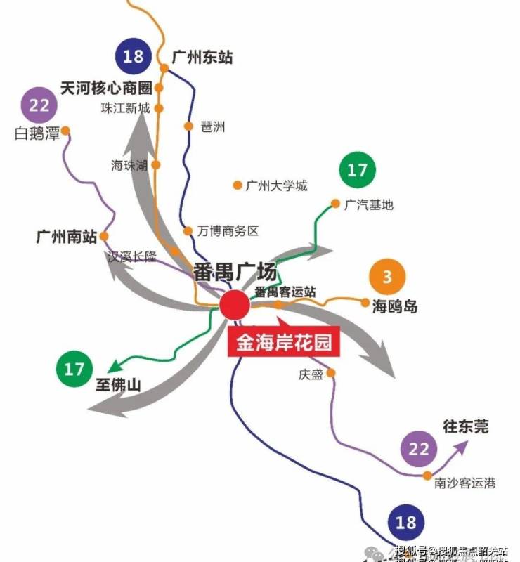 周边交通:3 号线 / 3 号线东延线 / 18 号线 / 22 号线 / 17 号线五轨交汇,毗邻番禺客运站、番禺广场双 TOD 枢纽