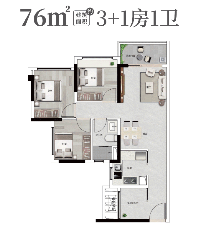 1. 76㎡三房:总价494万,首付2成仅需74万(公积金贷款);