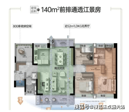建面约140㎡奢阔四房:双阳台+16米南向面宽,衣帽间+套房主卧。
