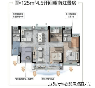 建面约125㎡王牌户型:4.5开间朝南+15米采光面,主次卧双南向。