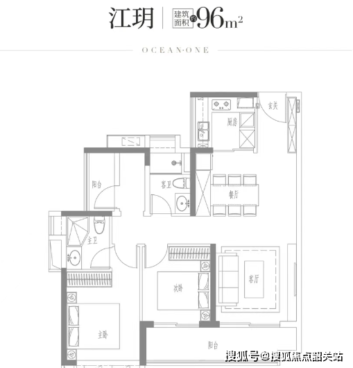 建面约96㎡竖厅:6.4米景观阳台+三开间朝南。