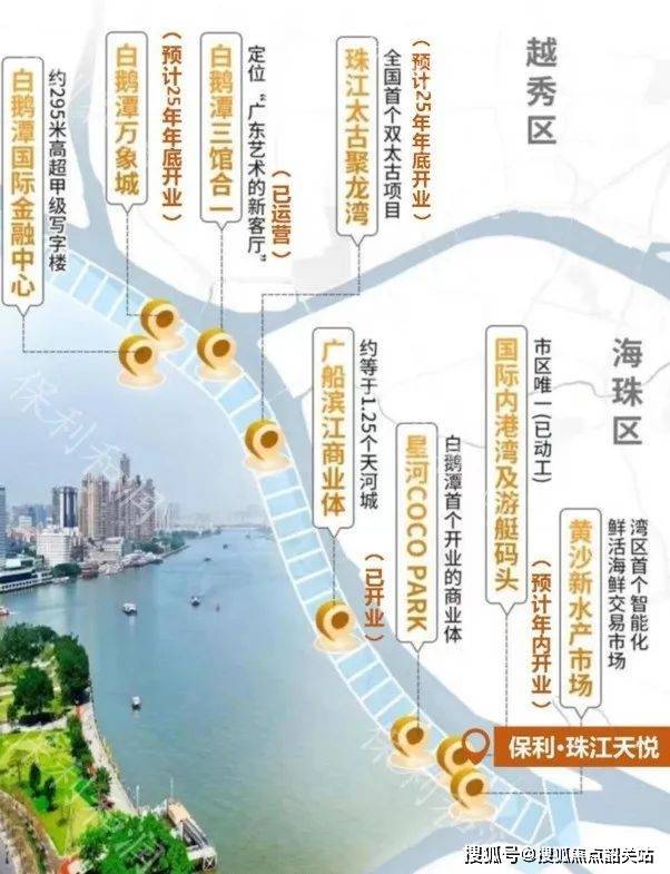 保利珠江印象坐落于广州市荔湾区东沙国际商贸港片区北地块,是保利地产于2024年以82亿拿下的东沙地块中的AF060610和AF060617两宗小地块之一。该项目位于白鹅潭滨江带的东沙板块,紧邻珠江,享有极佳的江景资源。凭借其优越的地理位置、便捷的交通条件以及丰富的配套设施,保利珠江印象成为了广州核心豪宅江景板块中的一颗新星。