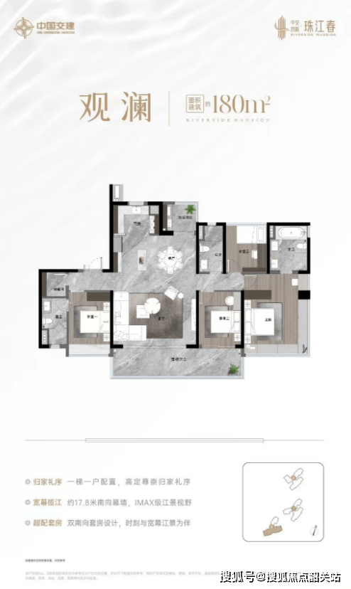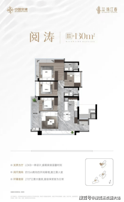 珠江春首推的户型面积主要集中在130-180平方米之间,均为大户型设计,确保了居住圈层的纯粹性和舒适度。所有户型均采用全南向设计,保证了充足的采光和景观视野。以下是一些典型户型简介: