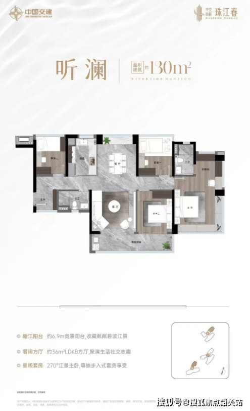 130平方米三房两厅两卫:南北通透,超大阳台设计,尽享一线江景。