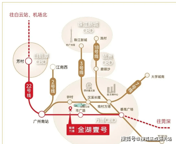 地理位置:敏捷万博金湖壹号坐落于番禺区钟村街市广路与福翠路交汇处,地处万博CBD核心辐射圈,紧邻敏捷集团总部,属于万博CBD 3.0时代的核心布局区域,北瞰金山湖文化公园,南望大夫山森林公园,地理位置得天独厚,既享受CBD的发展红利,又坐拥稀缺的生态资源,是万博板块内不可多得的宜居地块。项目周边成熟社区环绕,生活氛围浓厚,同时临近祈福、万博、长隆三大商圈,日常消费、休闲娱乐便捷无忧。