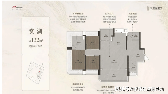 4. 132㎡ 四房两厅两卫(西南向):进阶四房首选户型,主打高端舒适居住体验,适配改善型家庭或追求品质生活的置业者。百米楼距园景,视野开阔,可欣赏社区园林与湖景双重美景,居住环境静谧舒适;环幕双景阳台,约5.8m阔尺设计,270°环幕视野,既能欣赏园林绿意,又能远眺湖光山色,阳台空间灵活,可打造休闲区、观景区;超50㎡超感大方厅,格局大气阔绰,通透开阔,客餐厅一体设计,搭配大尺度采光窗,室内采光充足、空间感十足,彰显高端人居气度;约30㎡奢华套房主卧设计,超15m奢阔南向面宽,搭配独立明卫、衣帽间与270°瞰景飘窗,全方位满足业主的高端居住需求,隐私性与舒适性拉满;其余卧室空间宽敞,布局合理,可根据需求改造为书房、儿童房、客房等,兼顾实用性与品质感。