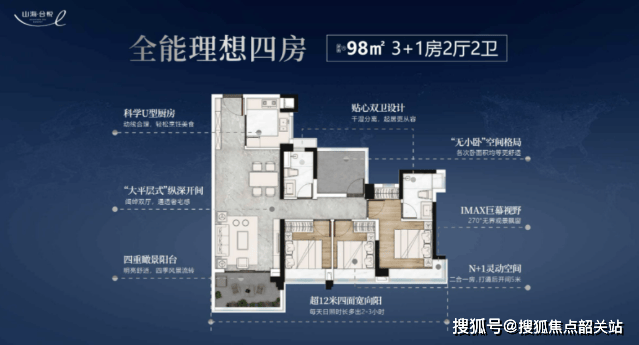 A:主力户型为83㎡三房和98㎡四房,采用“四面宽”设计,实用率高,部分户型拥有270°景观飘窗。