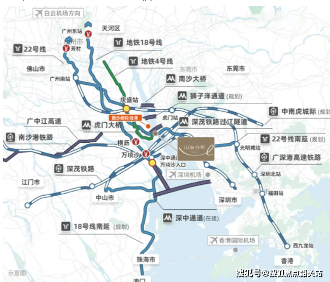 轨道交通是现代城市交通的大动脉。距离“山海合悦”项目仅900米的南沙客运港站,是未来重要的交通枢纽。该站点汇集了地铁4号线、规划中的15号线以及时速高达160公里的22号线(南连莞深)。
