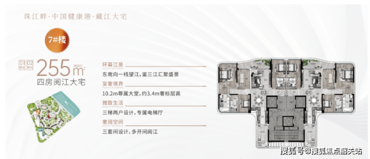 梯户比:3 梯 4 户 / 3 梯 2 户,专梯专户设计,私家电梯厅入户,私密性、尊崇感拉满,候梯时间<15 秒。