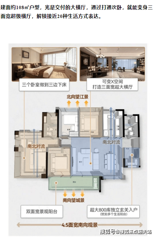 约107–108㎡四房:可灵活打通次卧,打造三面宽超级横厅,空间延展性强,满足多种生活场景需求。