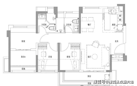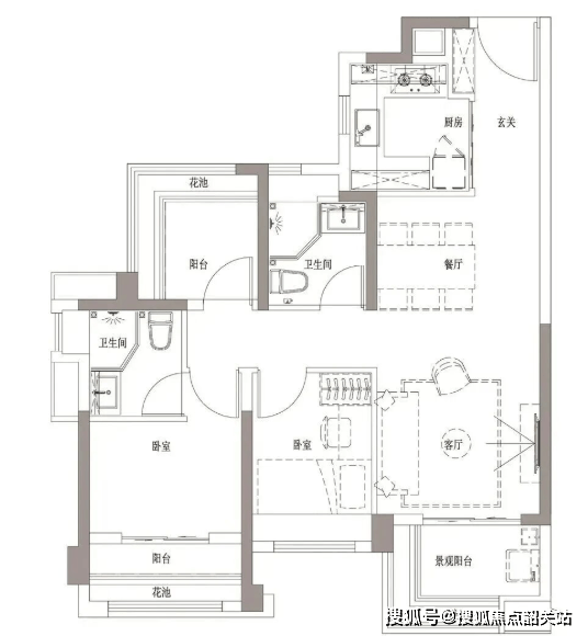 74㎡三房两卫:三开间朝南,卧室、阳台均享阳光,270°全景卧室搭配方正景观阳台,视野开阔;