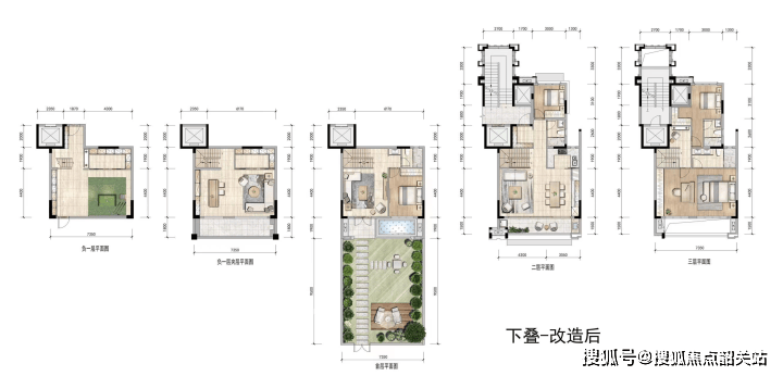 一层是近70㎡的私家花园,及会客厅及1间南向卧房,二层是餐客厅厨房及1间卧室,三层是休息区共有3间卧室。