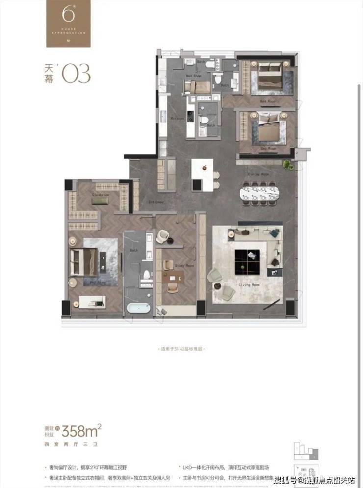项目一线临江,搭配现代商务全玻璃幕墙,南高北低,最大程度展现一线江景。