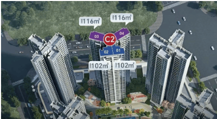 116㎡四空间两卫:五开间朝南,南北对流,一线湖景,既能享受园景,更能享受湖景的大户型。