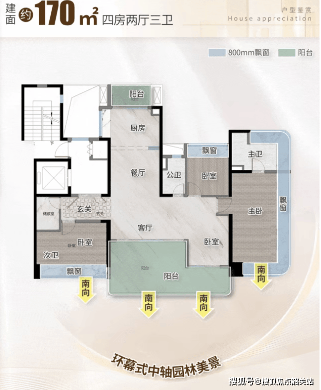 全南向四房:方正格局,四面宽朝南,南向采光面约 12 米,阳光满屋;