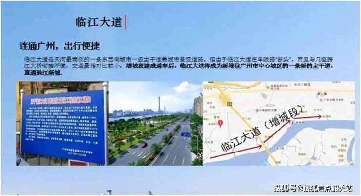 临江大道是目前广州稀缺景观主干道之一,是广州CBD珠江新城的景观展示标杆道路,为推动广州国际金融城开发建设及缓解黄埔大道的交通压力,临江大道将东延至新塘镇,成为广州自东向西的新主干道,项目位于临江大道东端,建成后,从项目出发,30分钟一路直通到珠江新城,实现30分钟天河生活圈