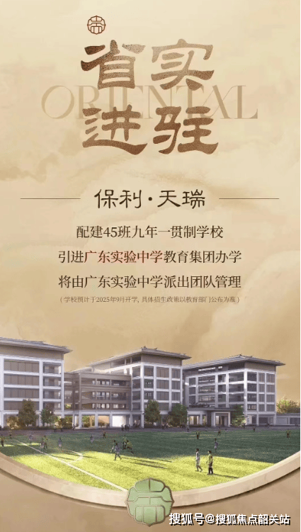 保利天瑞教育配套完善,配建一所 18 班的幼儿园以及一所 45 班的九年制学校。今年 4 月,学校正式官宣引入广东实验中学教育集团办学,并由广东实验中学派出团队进行管理。这一举措不仅为业主子女解决了 12 年的教育问题,更是天河楼盘配建公办学校引进省市属品牌办学的首次尝试,对天河教育发展具有重要意义,同时也成为项目的一大核心竞争力。学校预计 2025 年 9 月开学,具体招生政策以当年教育部门公布为准。