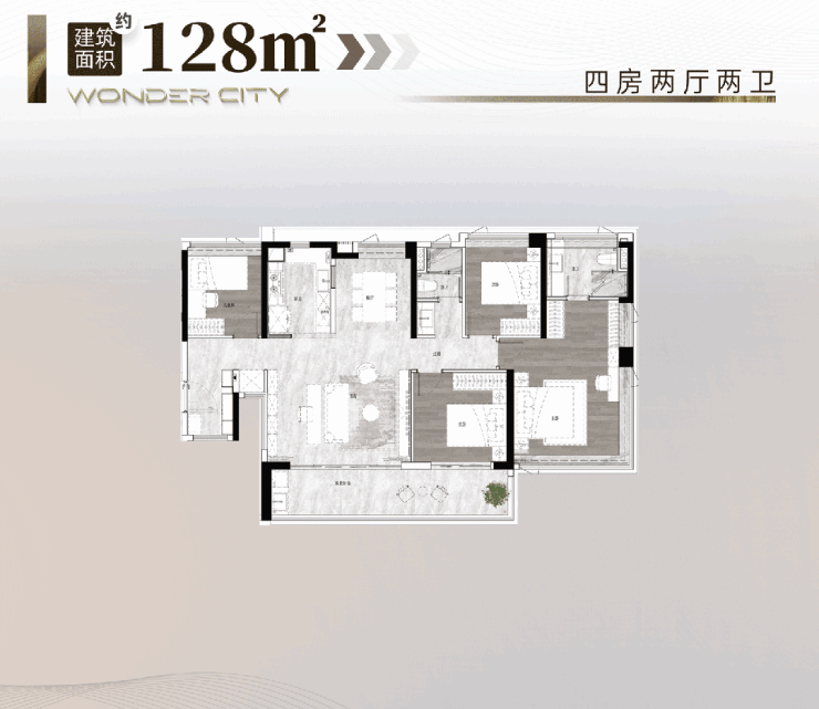 户型产品是本项目最具竞争力的维度之一。一期在售建面约122至186平方米四房,全部实现南向超大面宽与巨幕阳台配置,其中主力141平方米户型拥有约6.1米客厅开间,餐客厅总面积超30平方米,媲美市面上150平方米以上大平层空间尺度。二期即将推出的建面约105平方米四房两厅两卫户型,创新实现四开间朝南、LDKB一体化布局,主卧配备270度全景飘窗,可俯瞰锦绣香江别墅区低密景观;而128平方米户型更将南向面宽拉至约15.65米,阳台进深达8.65米,南北对流设计确保全屋通透。所有户型均通过飘窗拓展实现110%至120%的实际使用率,收纳系统覆盖玄关、走廊、卧室等全域空间,满足多代同堂家庭的多样化需求。