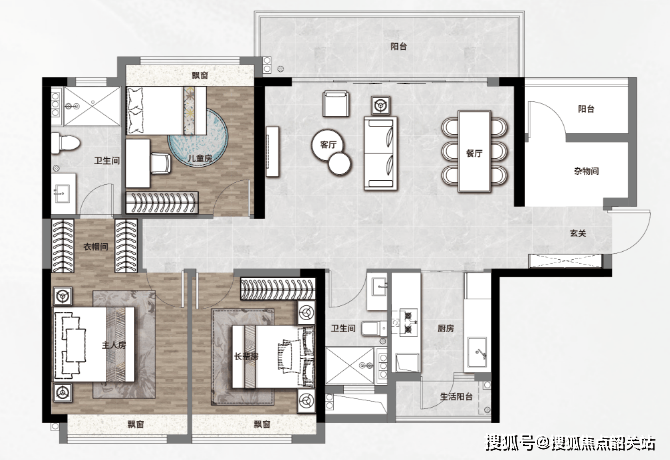 105㎡三房两厅两卫,三开间朝南的三房户型,约3.9m的大开间竖厅,动静分离;双阳台设计,望一线园景、山景。