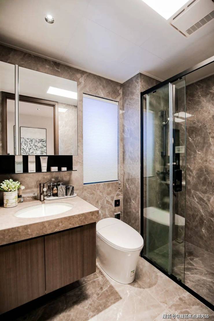 卫浴:镜柜多出金属托和镜前灯,主卫带有抽拉龙头、卫浴金属壁龛、三联淋雨屏、智能马桶、清洁喷枪、暖风机等贴心交标。