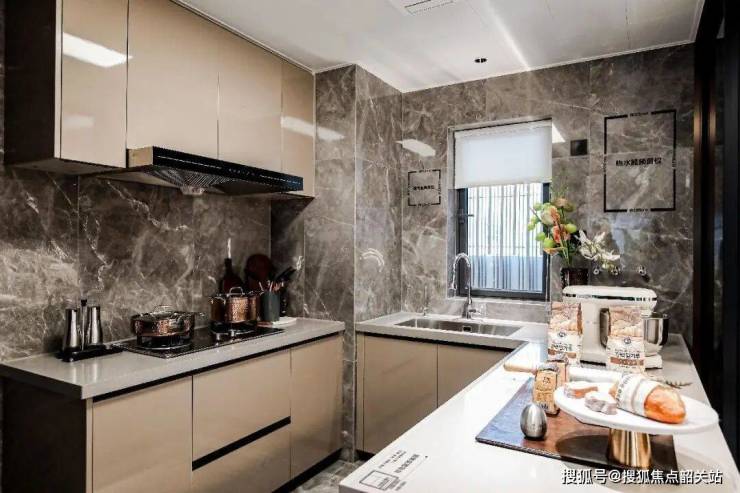 厨房:抽拉水龙头、大单盆水槽,操作台4边小挡水,灶下橱柜上层翻板,下层抽屉升级设计,收纳比传统户型多出2m³。