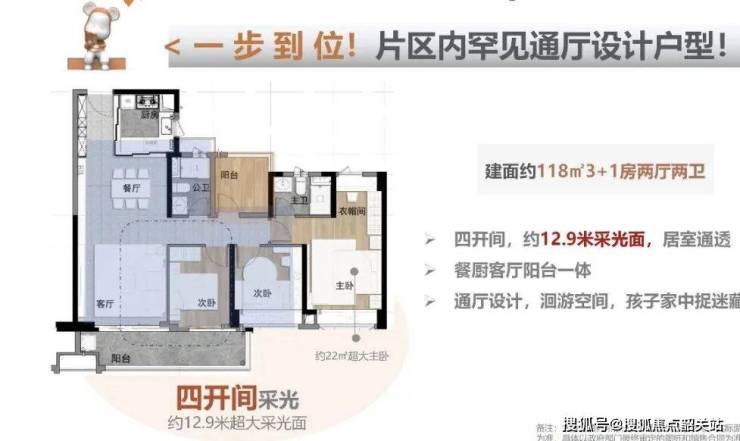 亮点:可以说是周边最强三房户型。横厅设计,餐厅飘窗、客厅阳台,客餐厅都有南向采光。